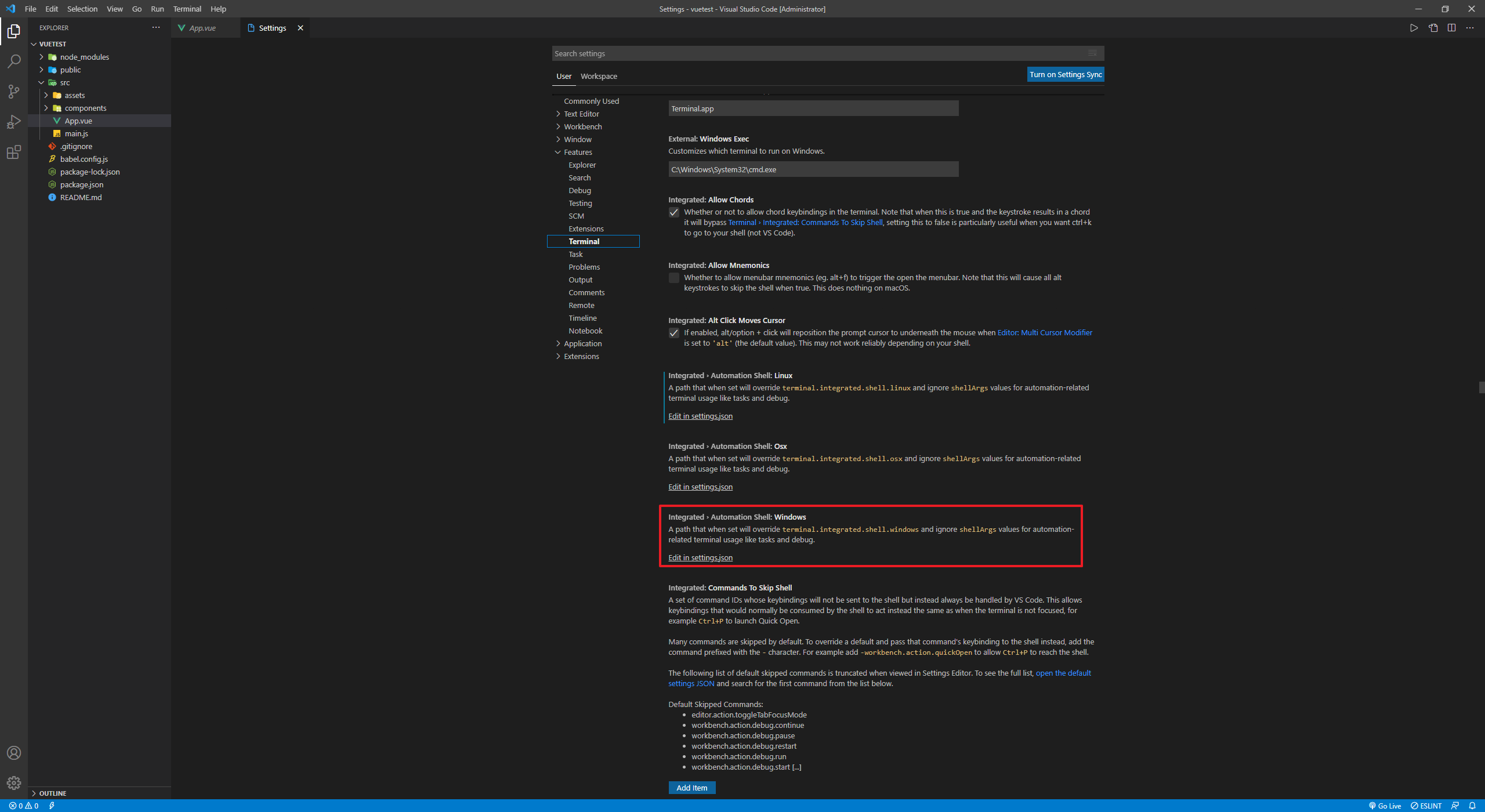 - setting > Features > Terminal > Integrated › Automation Shell: Windows > Edit in settings.json 클릭